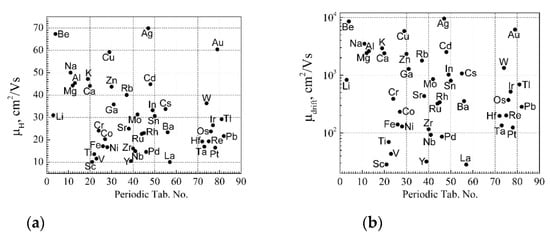 It follows from Equations (27) and (35) that the Hall mobility for a single type of free charge carriers can also be expressed as . The absolute values of the Hall mobilities of the free RM charge carriers of elemental metals’ distribution in the periodic table are shown in Figure 8a at room temperature. The Hall mobility values are distributed in the range 10–70 cm2/Vs. The highest Hall mobilities have Ag, Be, and Au, and the lowest ones have La, Sc, Y, and V. The absolute values of the drift mobilities of free RM charge carriers of the elemental metal distribution in the periodic table are shown in Figure 8b at room temperature. The drift mobility values for different elemental metals are distributed in a very wide range, from 30 cm2/Vs to 104 cm2/Vs, and this causes the very wide distribution of the conductivity values of elemental metals. The highest values of drift mobility have Ag, Be, Au, and Cu, and the lowest ones have Sc, Y, La, and V.