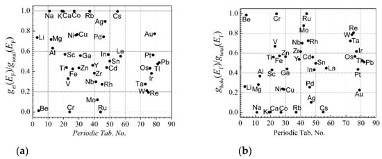 is the quantity that plays the role of compensation in Hall voltages caused by electrons and holes in the Hall effect measurement. Thus, from the Hall coefficient RH2 data of metals (Figure 7a) and Equation (31) for RH1, it is possible to determine the compensation quantity η and the relative parts of electron-like or hole-like densities of states at the Fermi surface. The relative electron-like and hole-like DOS parts are shown in Figure 9a,b, respectively.
