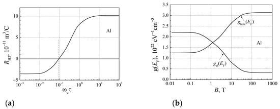 The measurement results of the Hall coefficient show that its value depends on the magnetic field strength [38]. Figure 10a shows the Hall coefficient RH2 dependence of the magnetic field strength for aluminum, where the parameter of the magnetic field strength is expressed by the cyclotron frequency , where B is the magnetic flux density and τ is the charge carrier mean free flight time. It can be seen that at low magnetic field strengths () the Hall coefficient is negative and electrons are the dominant free charge carriers, but with a high magnetic field the Hall coefficient is positive and holes are the dominant free charge carrier.