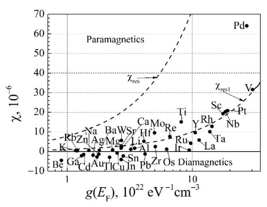 Magnetic susceptibility dependence on the DOS at the Fermi surface for non-ferromagnetic metals: the points are the experimental data from [35], the dashed curve χres is calculated with Equation (53), and the curve χres1 = (1/7)χres is plotted as an average value.