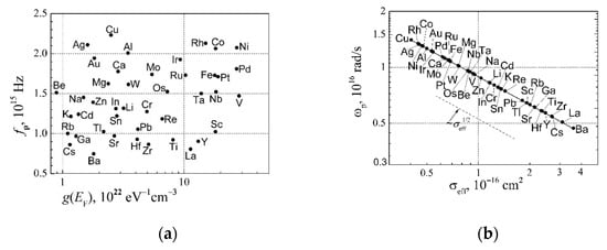 It can be seen that the plasma frequency does not depend on the temperature. The dependence of the plasma frequency fp = ωp/2π on the DOS g(EF) at the Fermi surface for elemental metals is shown in Figure 12a. It can be seen that there is no correlation between plasma frequency and DOS at the Fermi surface for different metals.