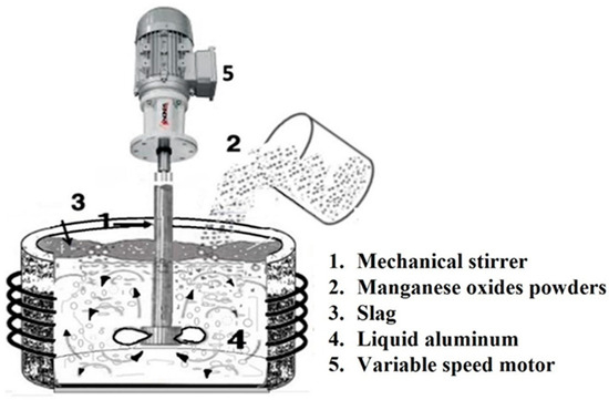 Because of the necessity for a preliminary basis for the subsequent presentation of results and discussion, we characterized Mn3O4 and MnO powders using scanning electron microscopy and chemical analysis by atomic absorption spectrophotometry, utilizing the Philips Scanning Electron Microscope model XL30 (Philips, Eindhoven, The Netherlands). The first technique allowed us to determine the morphological characteristics of the powder particles, while the second technique helped us ascertain the purity of both oxides. We acquired these oxides from the company Merck Aldrich’s Mexican subsidiary (Toluca, Mexico). Subsequently, we prepared the Al-Mg alloys from the aluminum found in beverage cans (the chemical composition is provided in Table 1) and commercial-grade Mg (99% by weight) using a medium-frequency induction furnace. The unit presented in Figure 1 has a tailored-made stirring system that employed a Caframo brand graphite impeller coupled to a variable speed motor manufactured by KB controls (Santa Fe Springs, CA, USA); the rest of the unit was custom-made and assembled within the lab.