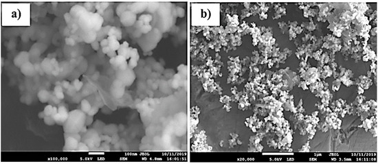 First, we present the results of the characteristics of MnO. Morphological characteristics of the oxide particles used were observed in the scanning electron microscope. It should be noted that the purity determined by atomic absorption spectrophotometry was 97% by weight for Mn3O4 and 99% by weight for MnO. The micrographs in Figure 2 and Figure 3 display the irregular shapes of the MnO and Mn3O4 particles. The micrograph in Figure 2a shows particles with small cracks. The pore shape was irregular with an average size of around 1 μm. This was seen and analyzed in a previous study, where it was mentioned that Mn3O4 had an octahedral morphology with oxygen vacancies at the electrolyte interface [31]. The micrograph in Figure 3a shows this octahedral morphology of the particles of Mn3O4, which were rather spherical, with average diameters in the order of 100 nm. The micrograph in Figure 3b shows some agglomerates of particles.
