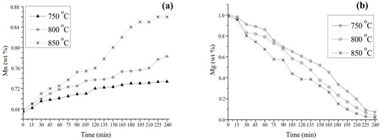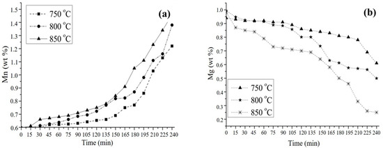 Figure 8 depicts the effect of treatment time on the Mn increase concentration in the alloy and on the decrease in magnesium concentration for different initial concentrations of magnesium in the alloy as indicated, using a constant temperature of 850 °C and at 300 rpm for the addition of MnO powders.