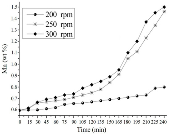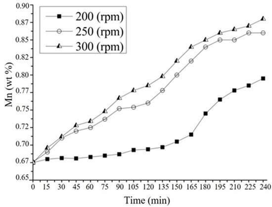 Figure 6 shows the results of the effect of treatment time on the increase in Mn concentration, at the indicated stirring rates, during the aluminothermic reduction of MnO powders at a constant temperature and degree of agitation. In this graph, the Mn concentrations can be observed close to 1.5% by weight, which was reached at the highest rate of agitation. In turn, Figure 7 presents the effect results of the treatment time for the increment considering the Mn concentration, at the indicated stirring speeds, during the aluminothermic reduction of Mn3O4 powders.