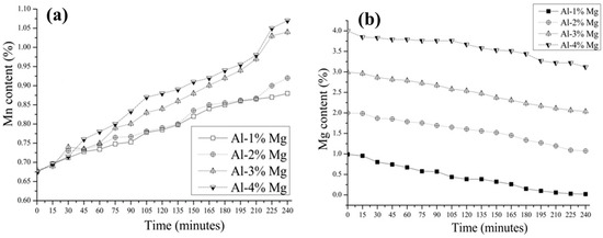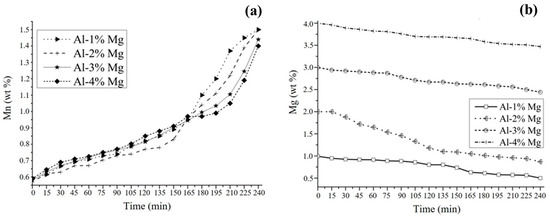 A critical factor is the effect of the initial concentration of Mg in the liquid alloy on the dissolution of solid particles of Mn oxides due to the tense-active nature of this element in molten aluminum. This leads to an improved wettability between the solid reagent and the molten metal, thus increasing the kinetics of the reactions at the solid–liquid interface [27,28,29,30].