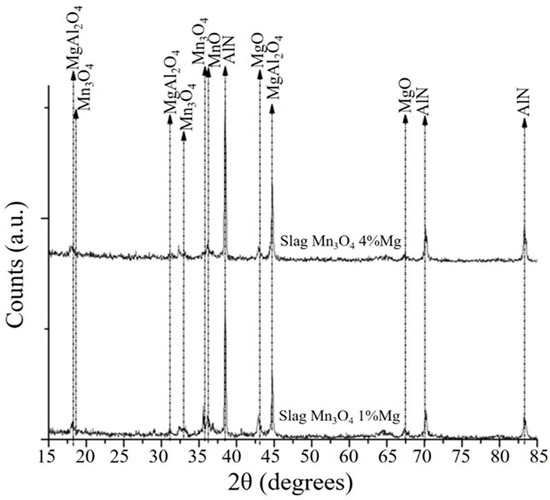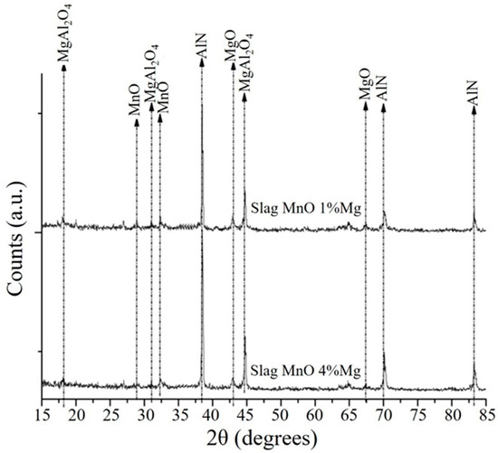 The mineralogical species determined for the slags obtained in the aluminothermic reduction experiments of the two types of oxides used varied significantly, since when MnO was used, the main products were MgO, MgAl2O4, and AlN, in addition to MnO, which passed into the slag without reacting. Meanwhile, when using Mn3O4 powders, the main reaction products, in addition to MgO, MgAl2O4, and AlN, contained MnO, indicating that Mn3O4 had been partly reduced to MnO, explaining the low reaction efficiency when using these powders. In both types of experiments, the presence of AlN is explained based on the high affinity of aluminum for nitrogen at temperatures above 700 °C, as discussed by Nabi [33].