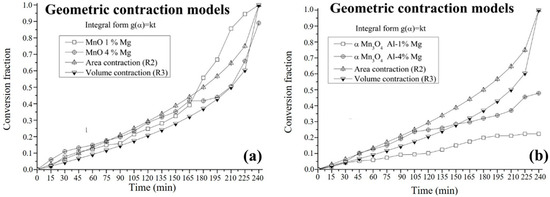Variation of the conversion fraction against time for the aluminothermic reduction of (a) MnO and (b) Mn3O4 to 850 °C, with a stirring speed of 300 rpm and initial concentrations Mg of 1 and 4% by weight. Predictions of the indicated kinetic models of geometric contraction are included.