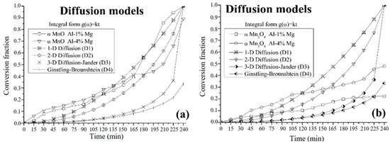 Figure 13 depicts the experimental data and predictions of the kinetic diffusion models for (a) MnO and (b) Mn3O4, at the experimental conditions indicated in each part of such figure.