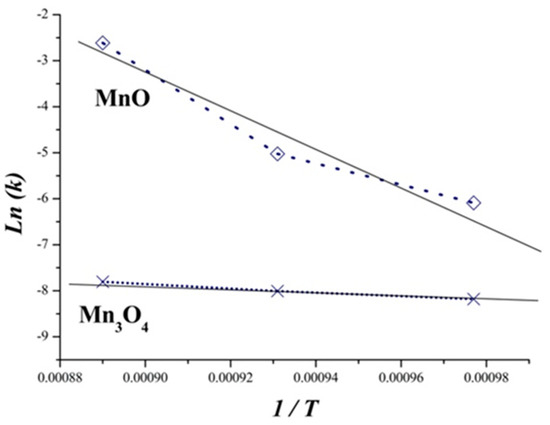 Plot of Ln(k) versus 1/T for the Ea calculation during the aluminothermic reduction reactions of Mn3O4 and MnO at a constant initial concentration of Mg and a constant agitation speed, and simple lines are the lineal regression of the experimental points.