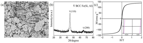Structural and magnetic properties of the FeSiAl flakes samples: (a) SEM image of FeSiAl flakes; (b) X-ray diffraction pattern of FeSiAl flakes; (c) magnetic hysteresis loops of FeSiAl flakes.