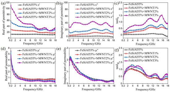 Electromagnetic parameters and loss tangents of the FeSiAl, FeSiAl/MWCNT1, FeSiAl/MWCNT2, and FeSiAl/MWCNT3 composites: (a) the real and (b) the imaginary part of permittivity, (c) dielectric loss tangent; and (d) the real and (e) the imaginary part of permeability, (f) magnetic loss tangent.