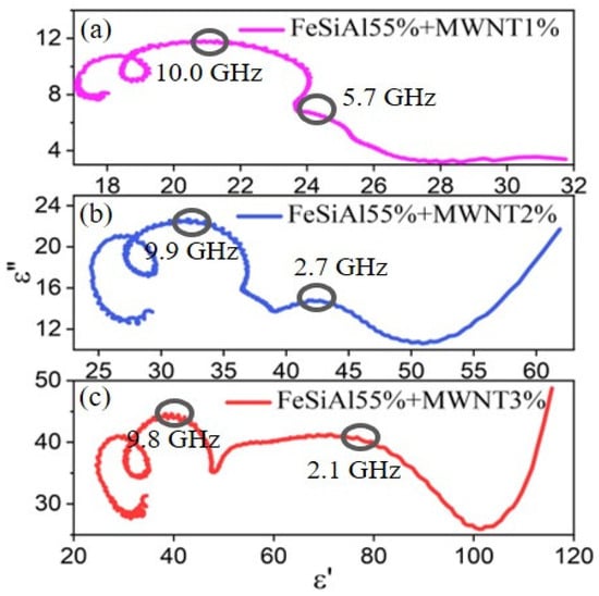 Cole–Cole circle curves of (a) FeSiAl/MWCNT1, (b) FeSiAl/MWCNT2, and (c) FeSiAl/MWCNT3.