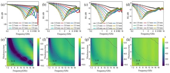where c is the light velocity in vacuum and is the peak frequency of absorbing materials. The reflection loss curves on the frequency and thickness of the four samples are illustrated in Figure 4e–h, and the tm with nλ/4 (n = 1, 3) position curves calculated by Equation (5) are also shown in these figures. It is obvious that absorption regions are concentrate on the 1/4 and 3/4 wavelength regions, and the absorption mechanism of the single-layer absorbing coating can be explained by the 1/4 wavelength resonance model.