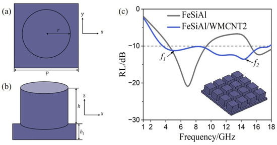 Structure of one unit: (a) top view, (b) cross-section view, and (c) RL curves of FeSiAl ADMMA and FeSiAl/MWCNT2 ADMMA; the inset represents periodic unit structures.
