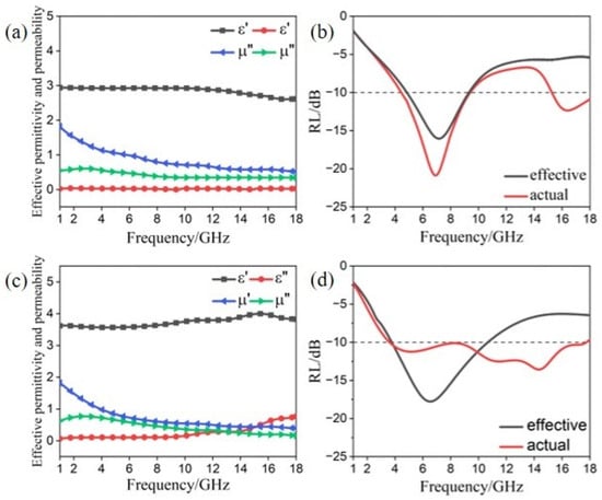 The effective medium electromagnetic parameters of the upper layer of flat-block FeSiAl ADMMA (a) and FeSiAl/MWCNT2 ADMMA (c); RL curves of effective and actual FeSiAl ADMMA (b) and FeSiAl/MWCNT2 ADMMA (d).