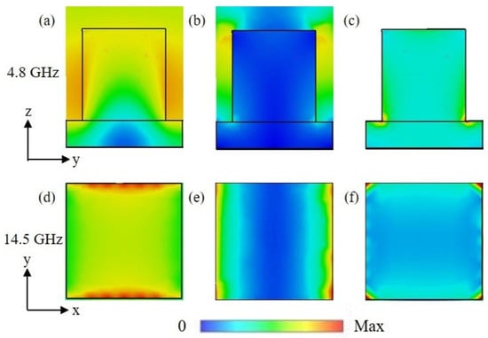 The distributions of magnetic field density, electric field density, and power loss density under normal incidence at 4.8 GHz (a–c) and 14.5 GHz (d–f), respectively.