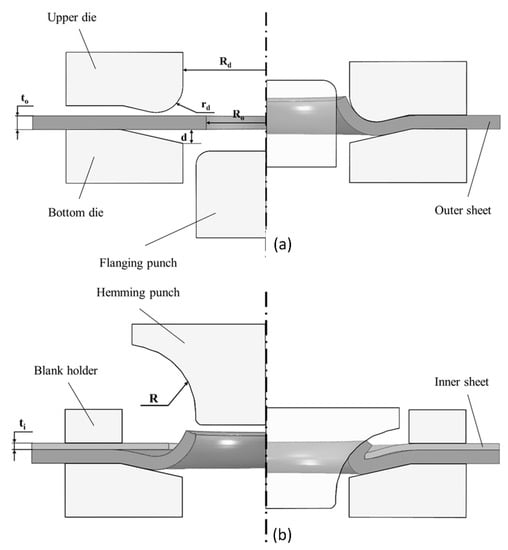 Schematic illustration of the hole hemming stages along with required punches and dies: (a) hole flanging stage and (b) hemming stage.