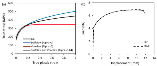 (a) Stress–strain curve of the AA 6082-T4 sheet modeled based on the Swift, Voce, and mixed Swift–Voce hardening laws, (b) comparison of the numerical load–displacement curve obtained based on the mixed Swift–Voce hardening law with the experimental one.