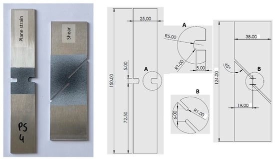Two additional tension tests with different geometries were conducted to determine the fracture behavior under distinct loading states, including the plane strain and shear tension states (see Figure 3). Specimens were fabricated from the supplied sheets along the rolling or extrusion direction using a CNC milling machine. Subsequently, these specimens were subjected to testing on the INSTRON 3367 at a constant speed of 1 mm/min. Similar to the uniaxial tension tests, the DIC system was used to measure the deformation of the specimens. The force–displacement curve and fracture displacement were extracted to calibrate fracture criteria under different stress states using the hybrid experimental–numerical approach.