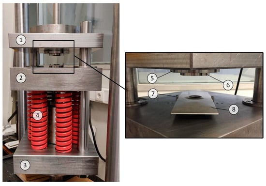 A specific flexible tool designed by the authors was used to carry out the hole hemming experiments in the laboratory [21]. Figure 4 illustrates the hole hemming tool employed in the designed experiments. The tool contains active components (punches and dies), passive components (die holder, punch holder, height adjuster, die holder, and middle plate), and structural components (upper plate, springs, bottom plate). During the process, the active components come into direct contact with the sheets, whereas the passive components provide support to the active components. The structural components, on the other hand, support and accommodate both the active and passive components.