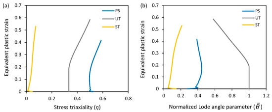 In Figure 9, the dashed line corresponds to the plane stress condition. Additionally, the theoretical values of recognized stress states, such as equal biaxial tension, uniaxial tension, pure shear, uniaxial compression, and equal biaxial compression, are depicted. The results demonstrate that the stress states of the tested specimens are close to the theoretical values. Furthermore, all the stress states closely align with the plane stress condition. Conclusively, it can be deduced that tension tests offer appropriate stress states for the calibration of fracture criteria.