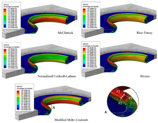 Damage distribution predicted by the different criteria in the outer sheet made of the AA6082-T4 at the hemming punch displacement of 8.6 mm.