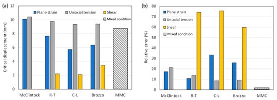 (a) Critical displacement predicted by the fracture criteria calibrated under different stress states and (b) corresponding errors.