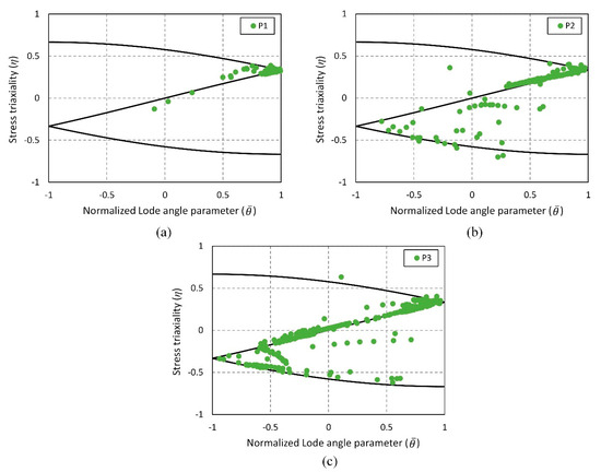 In order to understand the variations in the predictions of the fracture criteria, it is essential to examine the stress state in the critical area. Figure 13 illustrates the stress state at three points within the flange edge area, represented in the and space, during the hole hemming process. These points are located at the outer edge P1, representing the critical region predicted by the single-constant criteria, the center of the edge area P3, representing the critical region predicted by the MMC criterion, and an intermediate position P2, as depicted in Figure 11.