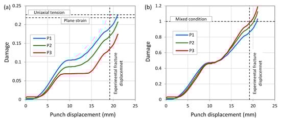The history of damage at these points also reveals the neglect of damage by the McClintock criterion when the shear mode prevails, causing the increase of damage to halt at the center point (P3), resulting in a plateau region (see Figure 15a). In the MMC criterion, the failure limit comprises two branches that converge in the state of pure uniaxial tension. In this criterion, the fracture limit in pure shear mode is lower than that in pure uniaxial tension. As a result, at the second and third points, as the deformation path shifts towards shear mode, damage accumulates more and more compared to the first point (refer to Figure 15b). However, by approaching the inner side of the flange, which is affected by the pressure applied by the punches, the amount of damage slightly decreases due to the increased fracture limit compared to pure shear mode. Thus, the MMC criterion predicts maximum damage at the center of the edge area (P3), with the region closer to the inner side exhibiting higher damage compared to the area closer to the outer side.