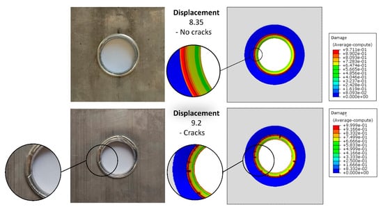 Figure 16 shows the comparison of the joint obtained in the experimental test, and that predicted using the finite element simulation. In this simulation, crack initiation and propagation were predicted based on the MMC criterion and using the element deletion technique. As seen, at a displacement of 8.35 mm, although the amount of damage at the edge is very high, it has not yet reached one. Thus, a crack is not observed at the edge of the flange, similar to the experimental sample. However, with an increase in displacement to 9.2 mm, the edge breaks. As observed, the MMC criterion can accurately model the crack initiation at the edge and its propagation towards the bend area.