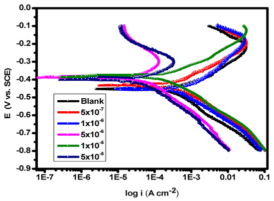 Potentiodynamic polarization experiments were carried out in 1.0 M HCl solution at 25 °C in the absence and presence of various concentrations of the substance (5 × 10–7–5 × 10–5 M) shown in Figure 2. The Icorr (corrosion current density) and the corrosion potential (Ecorr) of carbon steel in 1.0 M HCl solution without and with the inhibitor, as well as the inhibition efficiencies of the inhibitor (%η), are among the data derived from the PDP experiments that are included in Table 1. The difference between the Ecorr values of the utilized inhibitor and the blank solution was found to be less than 85 mV, demonstrating the mixed type of the inhibitors and lowering of the values of both the anodic and cathodic Tafel slope [53]. Figure 2 shows that the anodic metal dissolution and cathodic H2 reduction processes were controlled by adding the inhibitor to 1.0 M hydrochloric acid solution. Additionally, the significance of this inhibition increased with higher inhibitor dosages. According to the calculations, when the cathodic curves produce almost parallel lines, the hydrogen discharge process becomes slower. The presence of the inhibitor in an aggressive medium controls the activation of this reaction [54]. The results for βa and βc presented in Table 1 demonstrate that the dissolving mechanism remained constant despite a modest variation in the reactions of cathodic hydrogen reduction and anodic alloy dissolution [55,56]. By increasing the compound’s concentration, as depicted in Figure 3, its adsorption increased, improving the polarization resistance on the surface of the carbon steel [57]. The repeatability of an experiment is established by conducting it three times.