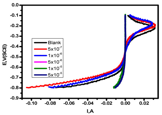 Linear sweep voltammetry of alloy in 1.0 M HCl solution and with varying concentrations of the inhibitor at 25 °C.
