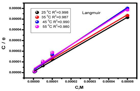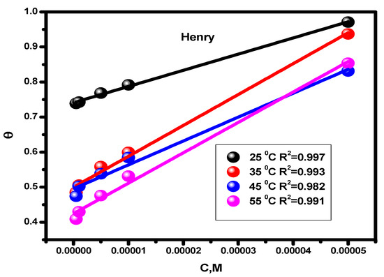 In order to protect the alloy surface from acidic attack, corrosion inhibitors adsorb protective layers onto it. This process can provide precise descriptions of the nature of the interaction between the molecules of the examined inhibitor and the steel surface [58]. For our new inhibitor, the experimental findings from the Tafel extrapolation method were fitted to various isotherms [59]. The data that the thermal model most closely resembles are given by Langmuir (Figure 4) and Henry’s (Figure 5) equations: