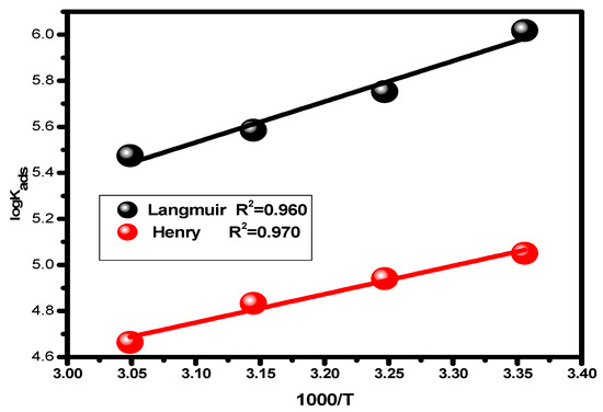 The enthalpy (ΔHads) value for the adsorption process was obtained by plotting log Kads vs. 1/T, Equation (10), Figure 6. Following the application of Equation (11), employing the enthalpy and standard free energy values, the entropy values (ΔSads) were intended [61,62].