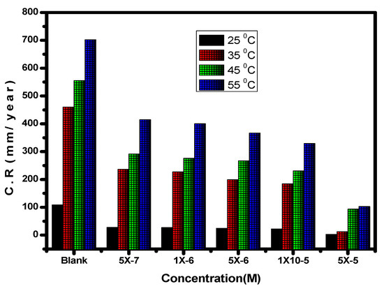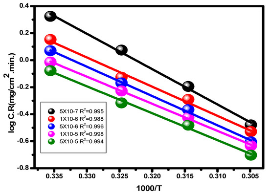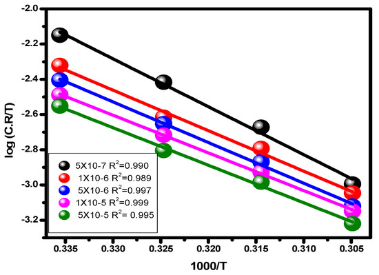 The letters A, E*a, and C.R stand for a constant that depends on the kind of metal, electrolyte, and apparent activation energy. The association between log (C.R/T) vs. 1/T for carbon steel in 1.0 M hydrochloric acid solution and at different dosages of the substance is shown in Figure 10. The transition condition is shown to be associated with the slope (−ΔH/2.303R) and the intercept (log (R/Nh) + ΔS/2.303R) [67].