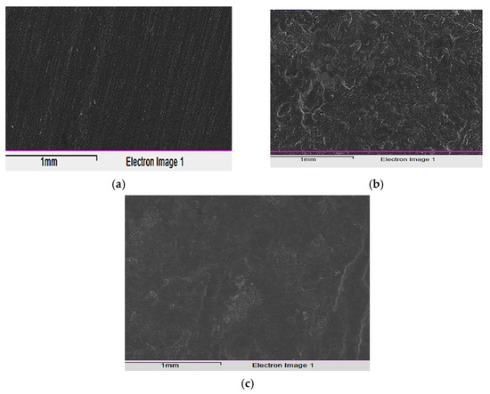 SEM images of: (a) alloy surface, (b) corroded surface in 1.0 M HCl solution (lacking inhibitor), and (c) with the inhibitor.