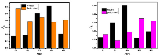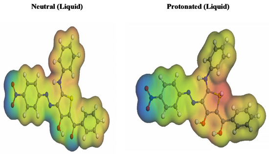 The effective 3D visual method known as MESP mappings can be used to differentiate between the total charge dispersion and the net electrostatic impact created over a molecule [83]. It is possible to discern the maximum electron density in Figure 14’s red hues, with MEP standing for the most significant negative (nucleophilic reaction). On the other side, the blue colours represent the electrophilic reaction [84]. Heteroatoms and double conjugate bonds are particularly prevalent in regions with high electron densities. Unfavorable positions are indicated by sulfur, nitrogen, and oxygen groups, which facilitate electrophilic attacks. The positive indications are the blue-colored hydrogen atoms, which are more vulnerable to nucleophilic assaults.