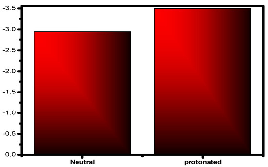 In order to understand the nature of the interaction between the inhibitor molecules’ adsorption centers and the alloy surface, DFT analyses were conducted. The ideal inhibitor molecules’ neutral and protonated structures are shown in Figure 13 along with their HOMO and LUMO distributions, and their quantum chemical characteristics are listed in Table 5. The frontier orbital theory states that the HOMO and LUMO energies govern the interaction between the inhibitor molecule and the metal [65]. Chemistry uses the terms EHOMO and ELUMO to refer to a molecule’s ability to give and obtain electrons separately [70]. Smaller ELUMO values indicate a compound’s capacity to receive electrons, whereas larger EHOMO values indicate a compound’s capacity to donate electrons to the open d-orbital on the surface of carbon steel [71]. It was also suggested that an inhibitor molecule with a higher efficacy in preventing corrosion would have a smaller energy hole among the LUMO and HOMO energies (ΔE). Due to the fact that removing an electron from its outer shell orbital only necessitates a small amount of ionization energy, an electron from the EHOMO state is provided to the ELUMO state. The EHOMO and ELUMO values in Table 5 show that the inhibitor can provide or take electrons, which is significant. The proton form of the compound has a smaller energy gap (ΔE) than the neutral form, indicating that the inhibitor reacts with the steel surface more forcefully [72]. Small energy gap molecules are more flexible than large energy gap ones. Because the electrons travel to the acceptor so quickly, the molecule is more reactive than harder materials. A substance’s composition, stability, and reactivity can all be determined using the absolute hardness (η) and softness (σ) values. The only part of the inhibitor molecule that can adsorb is the one with the greatest value for simple electron transfer [73]. The inhibitor molecules are converted to Lewis bases in the corrosion system, while alloy molecules are converted to Lewis acids. For avoiding the soft acid corrosion of bulk metals, soft-base inhibitors are the most effective. Information about structural organization is disseminated and rationalized using the dipole moment, the third important property [74,75]. Another indicator that is frequently used to forecast the direction of corrosion inhibition is the dipole moment (μ). It measures the polarity of the connection and reveals the number of electrons scattered within it. Strong dipole–dipole interactions between the inhibitor and iron surface result in better inhibition and long-lasting adsorption on the surface of carbon steel [76]. An organic dipole’s electrostatic attraction to a charged alloy surface speeds up the actual adsorption of the organic retarder onto the metal surface. Therefore, large dipole moments are favorable for adsorption molecules. The dipole torque in protons altered dramatically, as seen by analyzing the dipole moments, proving that the inhibitor is actually physically adsorbed on the steel surface in the form of a proton can molecule [77]. However, the research does not provide any indication of a connection between inhibitory efficacy [78]. It is asserted that the electronic inhibitor on the metal surface will be more effective at suppressing the reaction if ΔN is lower than 3.6 [79]. An electron’s ability to bind inhibitors (χ) is referred to as its electronegativity. As the attraction of an electron to a carbon steel surface grows stronger, the value of inh increases (the protonated version has a high value for electronegativity). Since the inhibitory particles are in stronger contact with the more electroactive carbon steel surface, there is higher inhibition, according to previous studies [79,80,81,82]. According to Table 5, the examined compound is a suitable inhibitor. By increasing the region where chemical molecules are in contact with the surface of carbon steel, the inhibition is more effective.