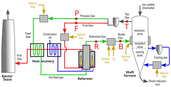 - The top gas (T) exhausted from the shaft furnace, rich in CO and H2, is completely recycled. A total of 30% of the top gas is recycled as a fuel gas (F) in the reformer and the heat recovery unit. The other fraction, called process gas (P), is recycled as a reducing agent.