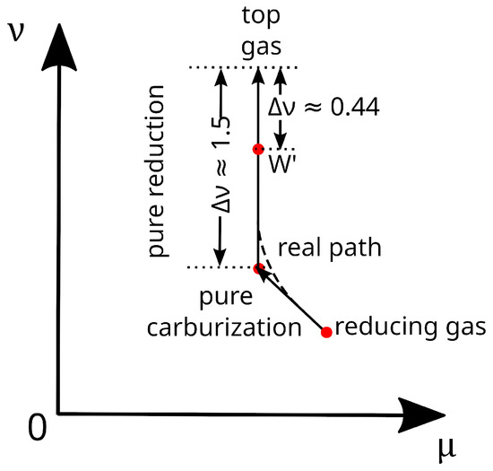 - Top Gas (node 5):The methodology described in Figure 5 is used to define the graphical position of the top gas. First, the decarburized gas, shown as C, corresponds to the composition of the reducing gas after complete carburization and before reduction. We simplify the process description by assuming that carburization and reduction take place in separate zones. Carburization is achieved by in situ methane reforming and the Boudouard reaction. It is generally accepted that both reactions occur in the lower part of the metallization zone, in the transition zone, favored by the high local temperature and the presence of metallic iron acting as a catalyst as explained by Shams and Moazeni [25] (2015) and simulated by Hamadeh et al. [26] (2018).Finally, the top gas is deduced from the decarburized gas. Based on the reduction rate from pellets to DRI, we determine the position of the top gas node T, as well as the pure wustite point node W’ defined in Section 2.4.