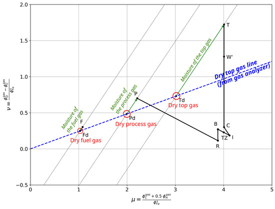 - Process Gas (node 1):The flow and dry composition of the process gas are measured in the plant using the top gas analyzer, while the moisture content of the gas is estimated based on the vapor saturation pressure derived from the gas temperature. The first node corresponding to the process gas is positioned and labeled P in the diagram. The fuel gas, represented by the node F, is calculated and plotted using the same methodology.