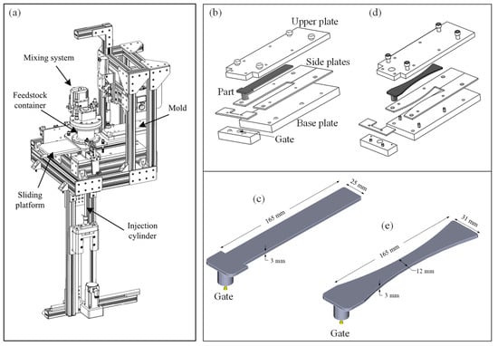 - Lamarre, S.G.; Demers, V.; Chatelain, J.F. Low-Pressure Powder Injection Molding Using an Innovative Injection Press Concept. Int. J. Adv. Manuf. Technol. 2017, 91, 2595–2605. [Google Scholar] [CrossRef]