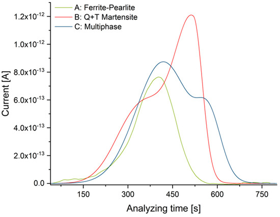 In the case of microstructure A (ferrite-pearlite), the microcapillary measurements amounted to a diffusive hydrogen content of 0.90 ± 0.18 ppm. Compared to the TDMS analyses (0.66 ppm), this concentration is slightly increased. This is traced back to the fact that the microcapillary was placed within the pearlite phase since the ferrite grains were smaller than the diameter of the glass capillary. Therefore, measurements solely within the ferrite phase were not feasible for material A. Due to pearlite’s higher solubility for hydrogen compared to ferrite, the current is shifted to values slightly higher than those gained by TDMS analysis.