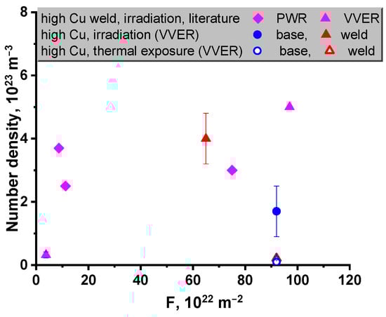 The density of precipitates as a function of fast neutron fluence in the studied high-Cu low-Ni steels (red and blue symbols) in comparison with the literature data [,,,,].