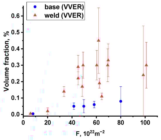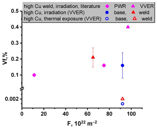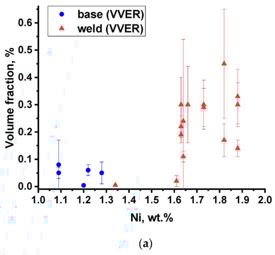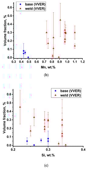 The effect of Si concentration is not so apparent. Figure 9 shows a trend for the volume fraction of precipitates for WM to decrease with Si concentration. Statistical analysis in [] also showed that within the range of silicon concentrations characteristic for RPV steels (0.2–0.6 wt.%), an increase in its content contributes to a decrease in radiation embrittlement. In addition, in the analytical relationships [] for determining radiation embrittlement, the silicon content is also included with a minus sign: