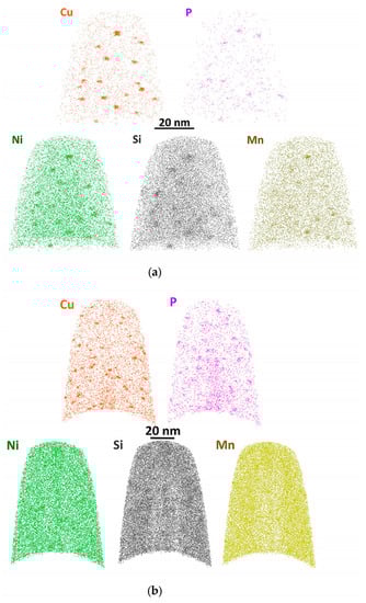 Copper-enriched precipitates in irradiated steels also contain Ni and Mn, with copper in the core, whereas Mn and Ni are concentrated in the shell (core-shell structure) [,,]. This indicates the existence of a Ni- and Mn-enriched interface. The existence of such a Cu–Ni/Mn–Fe buffer transition is energetically favored due to the sharp Cu/Fe interface, since due to the vanishingly small solubility of Cu in Fe, the interface energy for copper-enriched clusters in the iron matrix is relatively high, whereas Ni and Mn are much better soluble in Fe and at the same time have energetically favorable interactions with Cu, further reducing the interface energy [,]. It is worth noting that although copper-enriched and Ni-Mn-Si precipitates are usually considered as two different types, experimental results obtained by the APT method show that, if the Cu concentration in copper-enriched precipitates is not taken into account, the relative content of Mn and Ni in them is approximately the same [,].