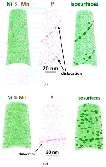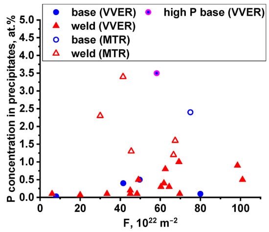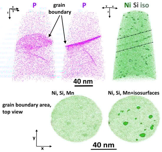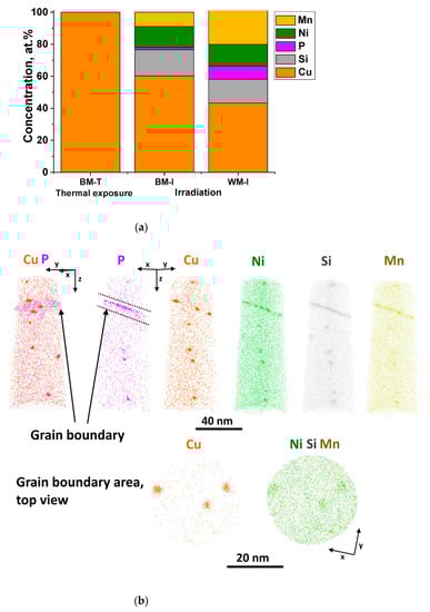 The diagram shows that the precipitates formed under prolonged thermal exposure (290 °C) comprise only copper and are characterized by low number density and size, whereas in the case of irradiation (270 °C), the precipitate composition also includes Ni, Mn, Si, and P. The higher volume fraction of precipitates of different compositions in the irradiated state compared to thermal exposure indicates the radiation-enhanced nature (due to an increase of the point defects number) of thermodynamically driven copper-enriched precipitates. In addition, the concentration of phosphorus in precipitates in irradiated WM (with high Mn content) is higher than in BM, in which phosphorus is spent on the formation of grain-boundary segregations (see Figure 4b). This is due to the peculiarities of grain-boundary segregation of phosphorus in materials with different structures and initial phase compositions [].