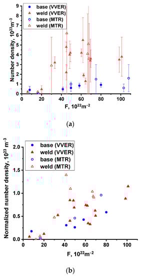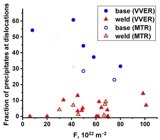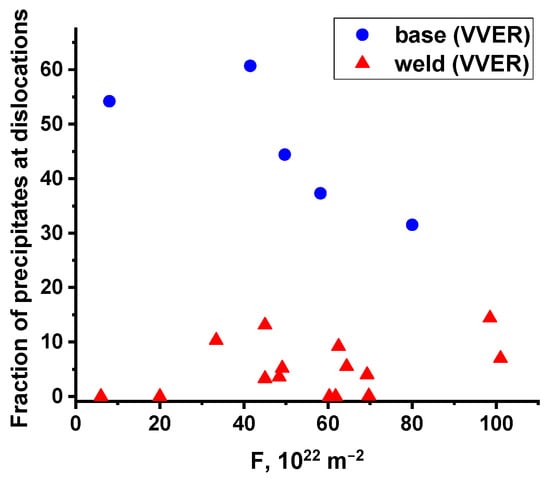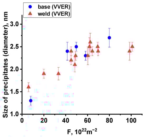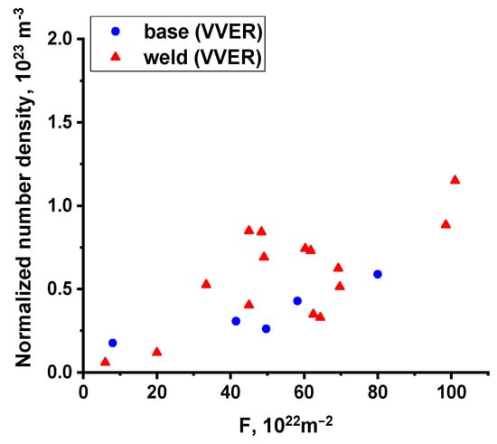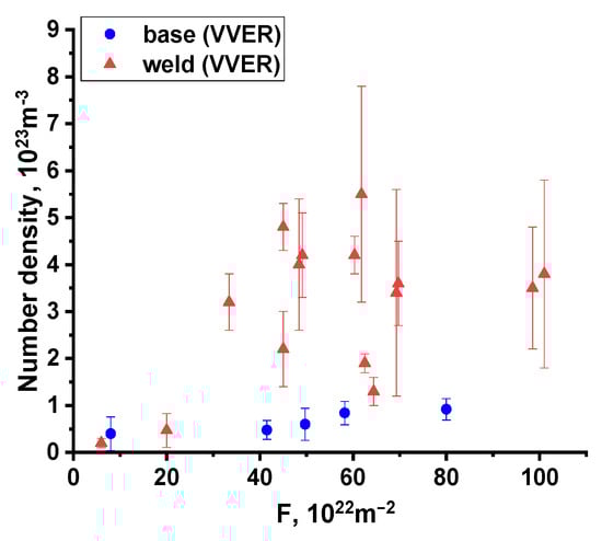 Figure 6, Figure 7 and Figure 8 show that irradiation leads to the formation of precipitates, the density of which depends not only on the irradiation dose (accumulated fluence) but also on the steel composition. Thus, for BM with significantly lower values of both Ni and Mn concentration in steel, the number density of precipitates is much lower. At the same time, a dose correlation is observed for both BM and WM, but for BM, it is weaker due to the lower absolute values.