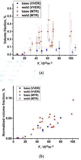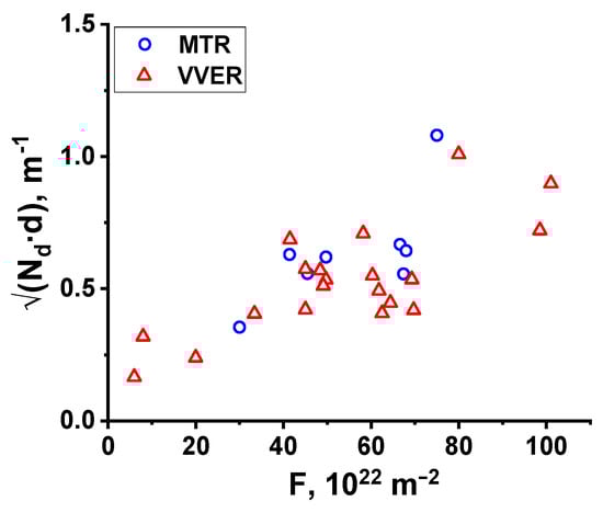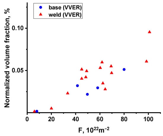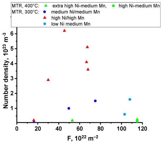 The dependences of the number, density, and volume fraction of precipitates presented in Figure 6 and Figure 8 show a correlation with the accumulated fluence due to the large differences in nickel and manganese composition. Therefore, the values of number density and volume fraction of precipitates were normalized by the concentration of precipitate-forming elements in steel (by the value (Ni×Mn/Si)). The choice of the normalizing factor was based on the following dependencies.
